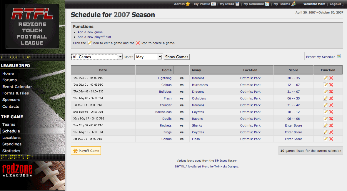 Easily manage your games using the Redzone schedule interface. Create, update, reschedule and remove games all with a few clicks of the mouse.